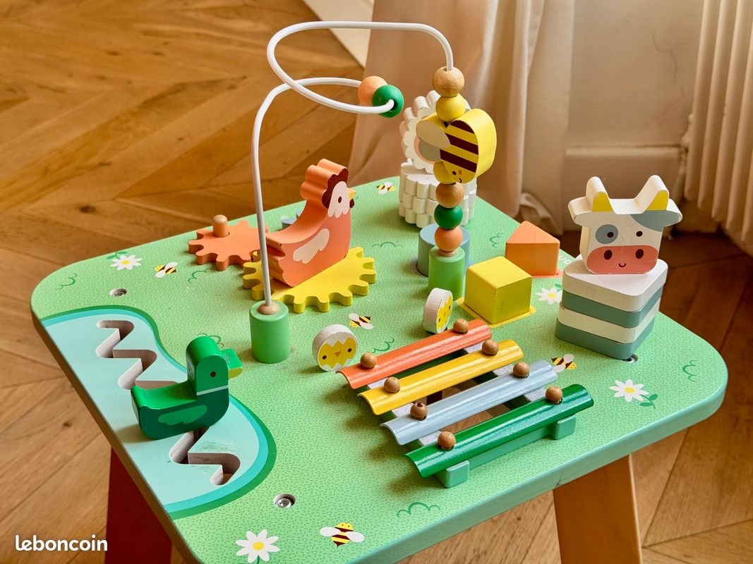 Direction la campagne et ses jolis champs de fleurs sauvages avec cette table multi-activités où les bébés retrouveront tous les animaux de la ferme ! Alors, c’est parti, faites découvrir de nouveaux jeux à votre enfant avec cette table d’activité en bois ultra complète qui propose 7 activités : 2 animaux à empiler de 2 manières différentes pour développer la motricité fine, un labyrinthe avec un canard à promener dans sa mare pour renforcer la coordination main/œil, un système d’engrenages à faire tourner pour le sensibiliser au rapport de cause à effet, 3 cubes à encastrer pour apprendre les formes, un boulier pour développer sa concentration et un xylophone en métal avec ses 2 baguettes pour son éveil musical. Avec cette table d’éveil en bois premier âge, les enfants à partir de 12 mois iront de découverte en découverte dans un univers qu’ils adorent ! On apprécie le design bucolique de cette table d’activité où bébé retrouvera un joli mouton, une adorable vache, une poule et ses petits poussins, un canard dans sa marre et une abeille qui virevolte autour du looping au centre de la table. A partir d’un an, les tout-petits commencent à explorer leur environnement. Ils ne manipulent pas seulement leurs jouets d’éveil mais se tiennent aussi debout pour voir toujours plus haut, plus loin. Une table d’activité Janod, c’est un support ludique qui permettra à bébé de se déplacer autour de la table au gré de ses envies et en fonction de l’activité préférée du jour ! Il pourra s’asseoir ou se tenir debout devant la table, et c’est parti pour toujours plus de découvertes dans la prairie ! La hauteur de la table est de 32 cm. Peinture à l’eau. L’éveil est dans le pré avec cette jolie table d’activités !