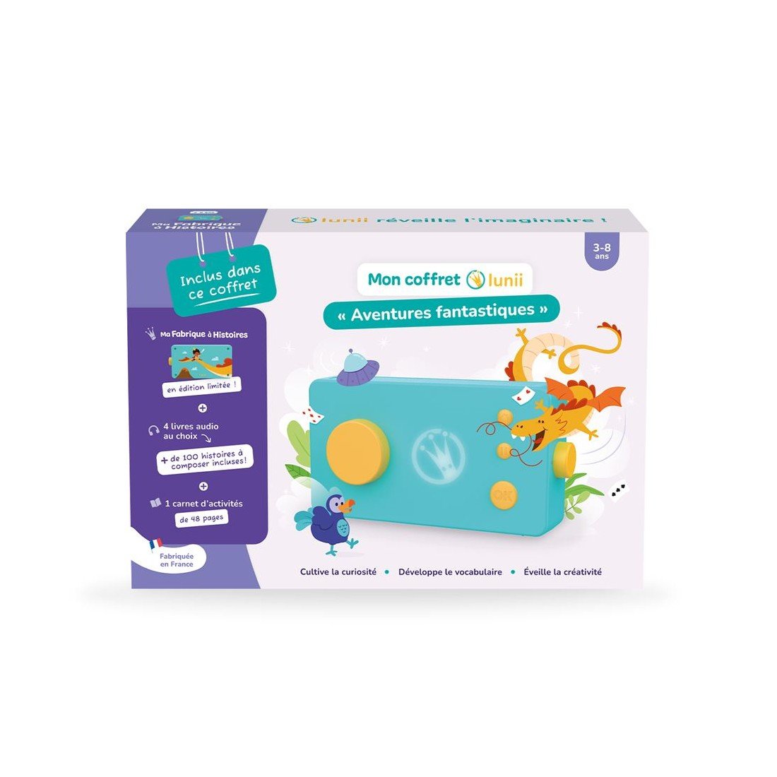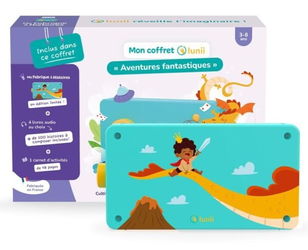 Plongez dans des récits extraordinaires où l’imagination n’a pas de limites ! Ce coffret comprend une conteuse Lunii au design inédit, 4 livres audio au choix (soit plus de 100 histoires interactives) et un carnet d’activités. Le coffret idéal pour développer la créativité et l’imaginaire de votre enfant, tout en l’éloignant des écrans.